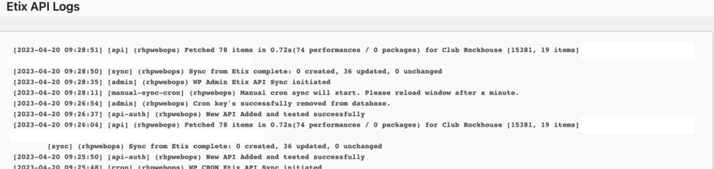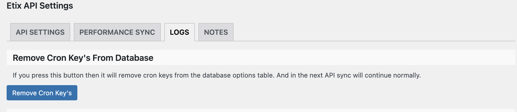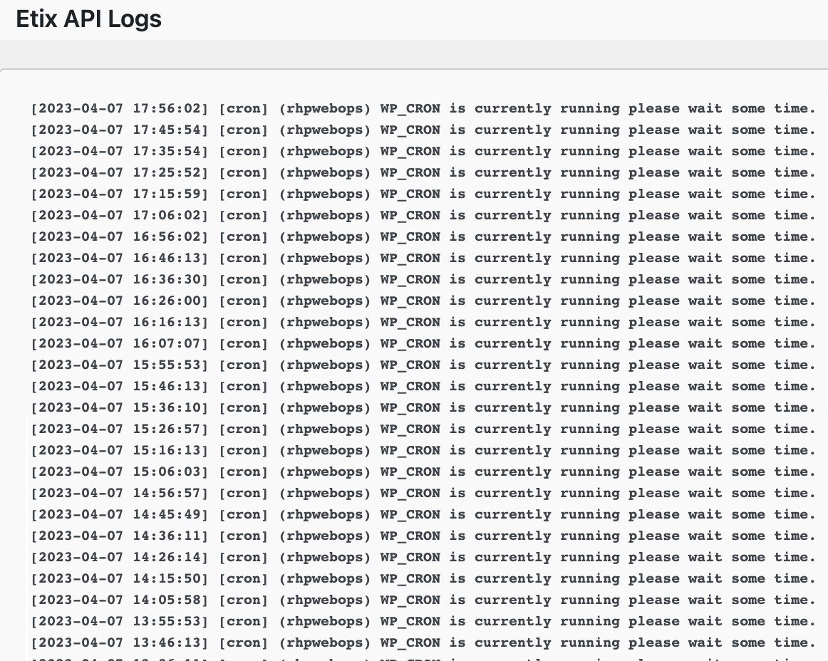 The log file indicates that the API is in a holding or stuck status. This is cleared by pressing the button “Remove Cron Key’s” in the above image.