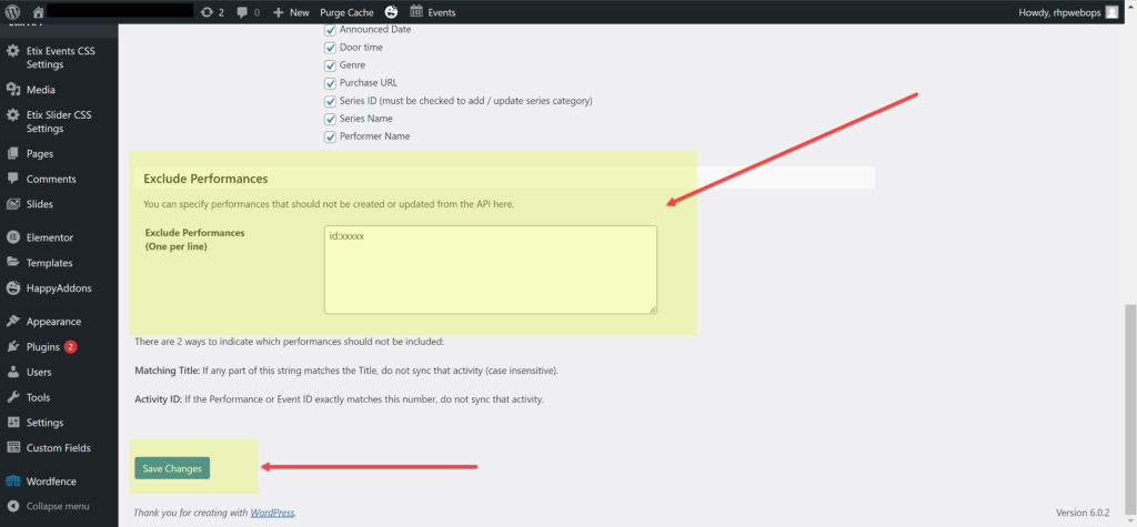 Events > Etix API > Performance Sync  > Exclude Performances > type ID:(enter event id here) > Click Save Changes