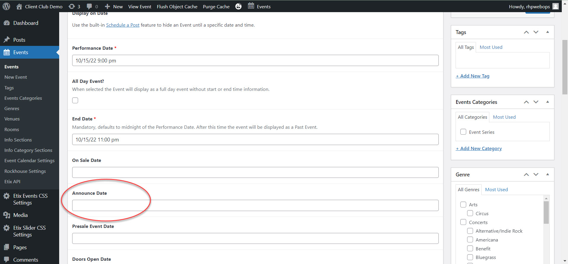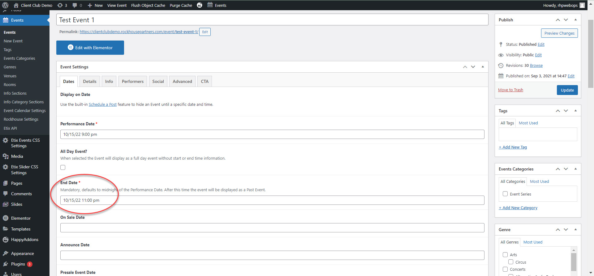 The end date is the date when the event will no longer be shown on the website. API events default to 11:59 PM on the event date.